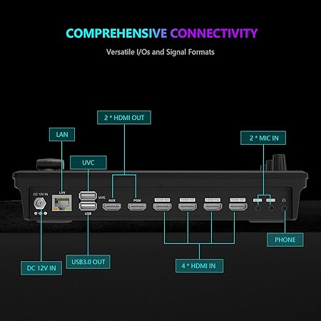 - 【Picture Effects and Output】Multi-picture combination conversion, low third dynamic overlay, dual HDMI PGM and MV variable channel output, horizontal and vertical articulation free switch